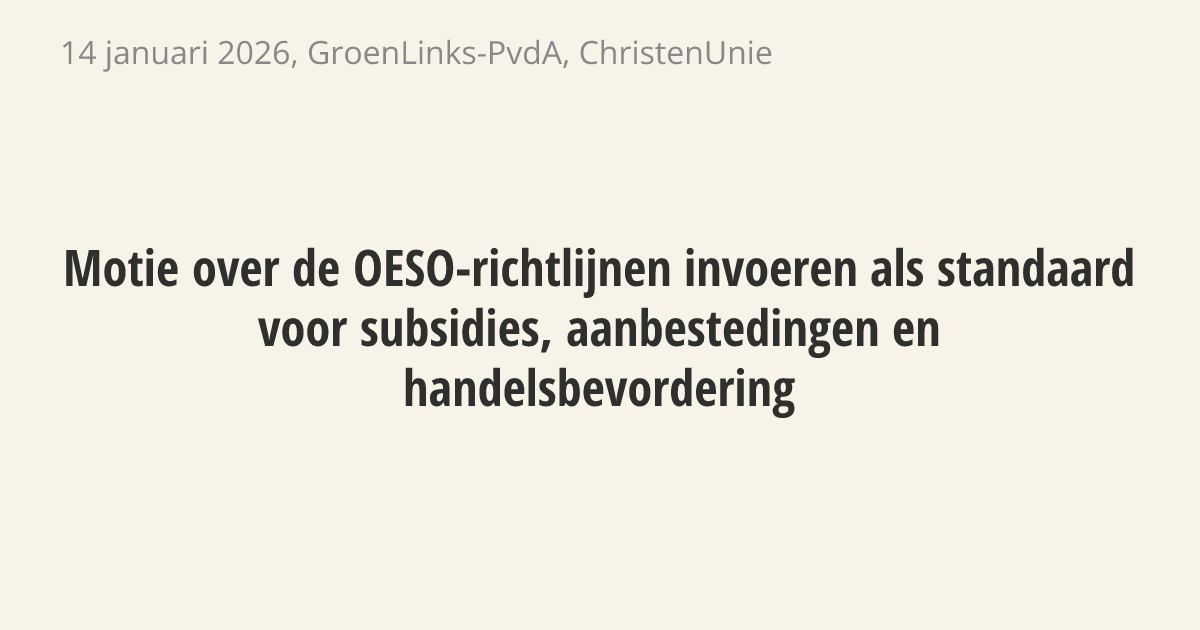 Het kabinet moet de OESO-richtlijnen voor maatschappelijk verantwoord ondernemen verplicht maken voor bedrijven die subsidies ontvangen of voor de overheid werken. Op dit moment houdt slechts 41 procent van de grote bedrijven zich aan deze internationale afspraken, terwijl de overheid streeft naar 90 procent. De overheid moet voortaan strenger controleren op de naleving van deze regels.