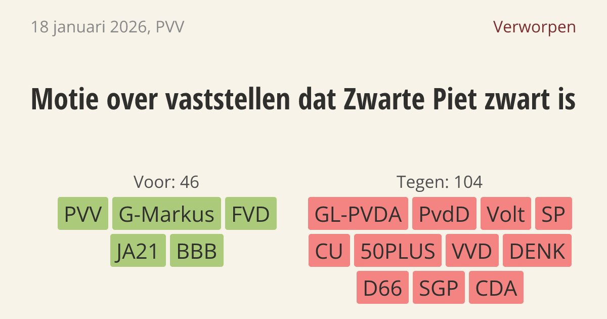 De regering moet de afbraak van Nederlandse cultuur en tradities stoppen. Zwarte Piet moet zwart blijven, omdat een meerderheid van de Nederlanders deze traditie nog steeds steunt.