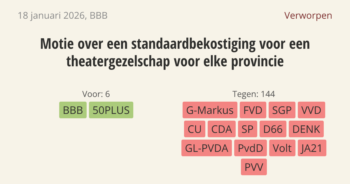 De regering moet ervoor zorgen dat elke provincie vanaf 2029 geld krijgt van het Rijk voor een eigen theatergezelschap. Nu zijn de subsidies voor cultuur ongelijk verdeeld over het land en hebben niet alle regio's een theatergroep die door de landelijke overheid wordt betaald. Een eerlijke spreiding is nodig om cultuur overal in Nederland bereikbaar te maken.
