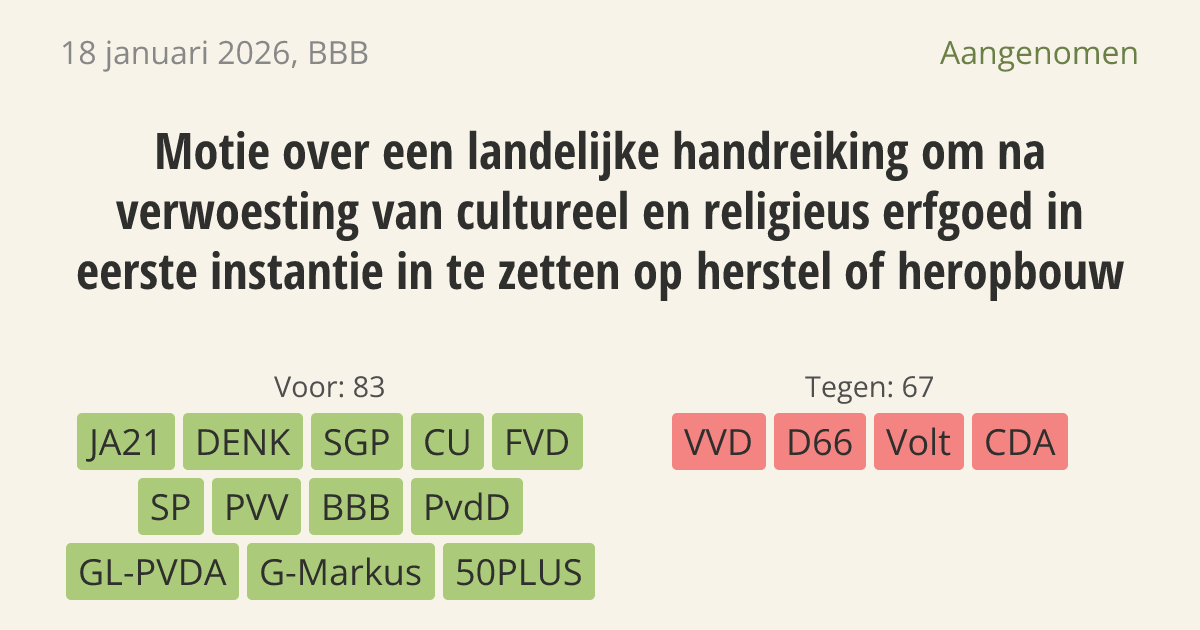 Motie van het lid Van der Plas over een landelijke handreiking om na verwoesting van cultureel en religieus erfgoed in eerste instantie in te zetten op herstel of heropbouw
