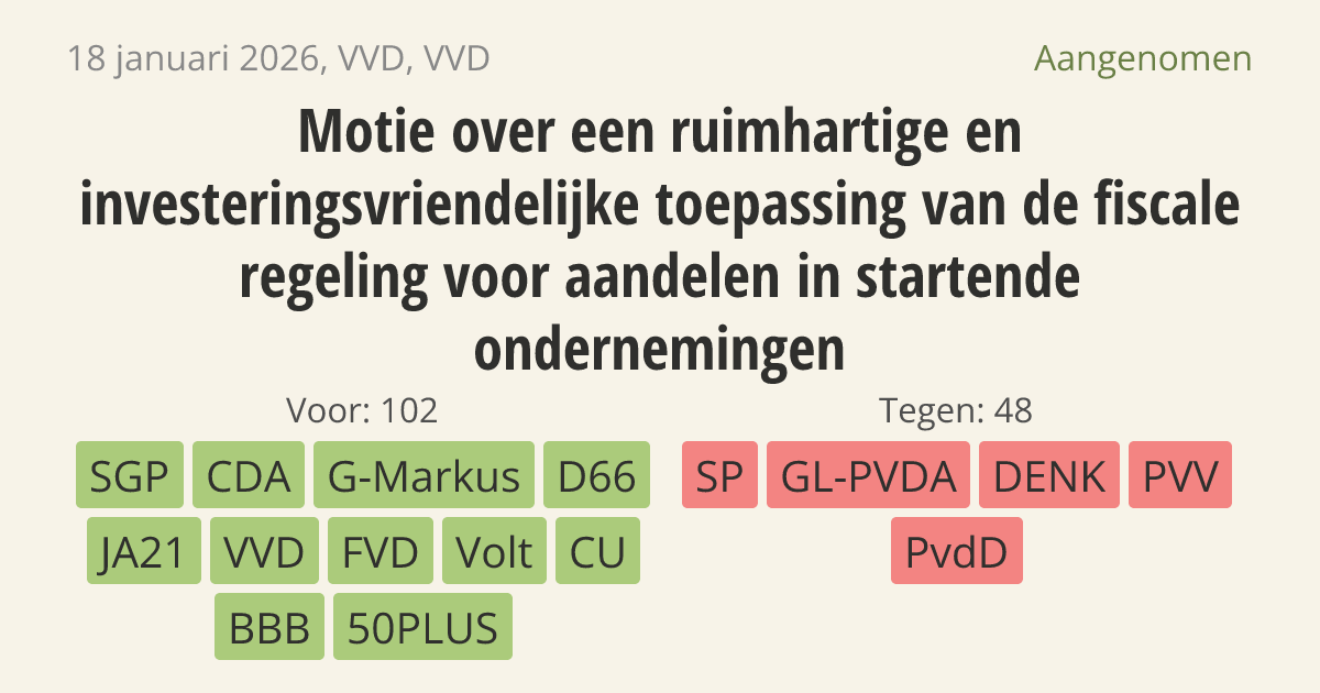De regering moet zorgen voor gunstige belastingregels voor beleggingen in jonge, innovatieve bedrijven (startups). Investeren in deze bedrijven is riskant en het geld zit vaak jarenlang vast. Daarom moet de overheid de belasting pas heffen als er echt winst wordt uitgekeerd. Dit stimuleert de economische groei en helpt ondernemers aan kapitaal.
