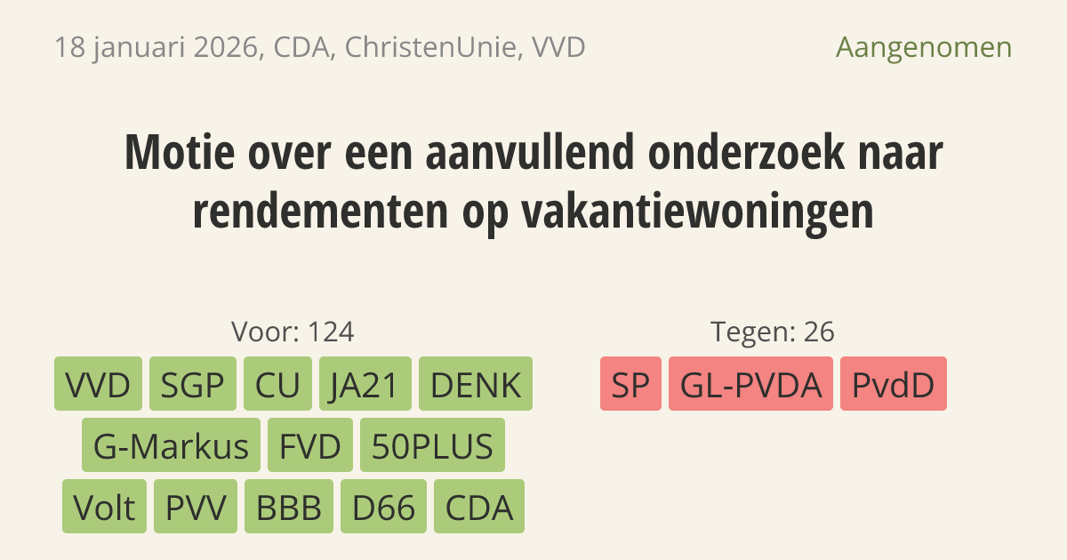 De regering moet extra onderzoek laten doen naar de belasting op vakantiewoningen. Er moet worden gekeken naar de opbrengst en de juridische houdbaarheid van deze belasting. Voor vakantiewoningen spelen speciale zaken mee, zoals het seizoen. Een juiste berekening is nodig om het recht op eigendom te beschermen.