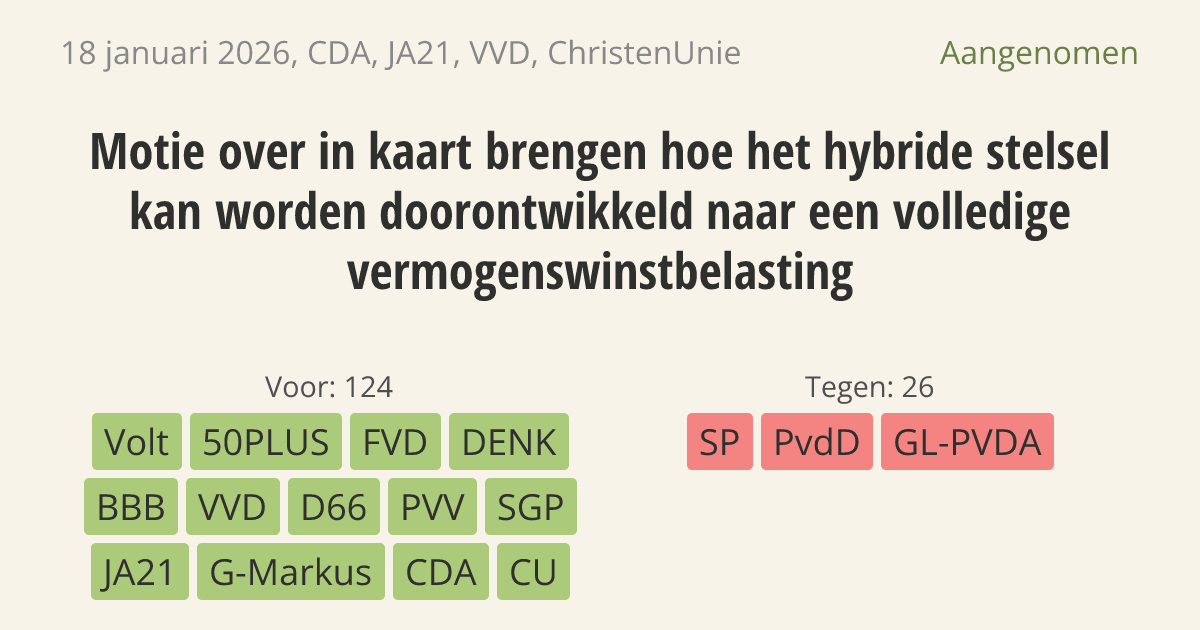 De regering moet een plan maken om box 3 om te vormen naar een volledige vermogenswinstbelasting. In dit systeem betalen mensen pas belasting als zij hun winst ook echt hebben ontvangen. Dit wordt als rechtvaardiger gezien dan het huidige systeem. Ook sluit een winstbelasting beter aan bij de regels in andere landen.