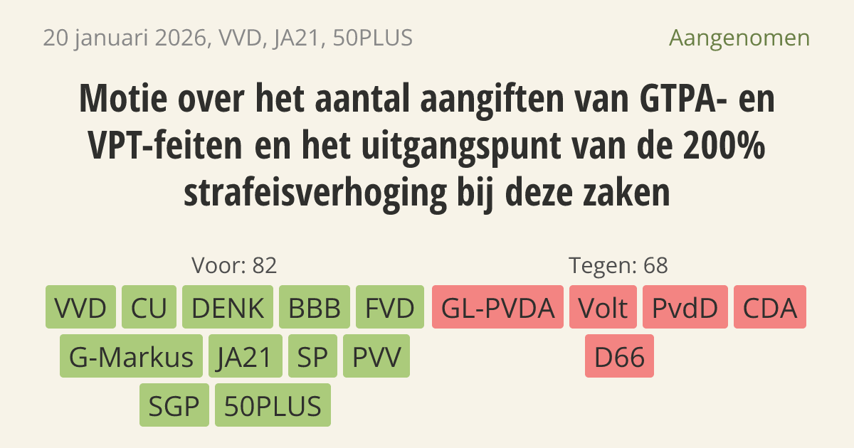 Motie van het lid Michon-Derkzen c.s. over het aantal aangiften van GTPA- en VPT-feiten en het uitgangspunt van de 200% strafeisverhoging bij deze zaken