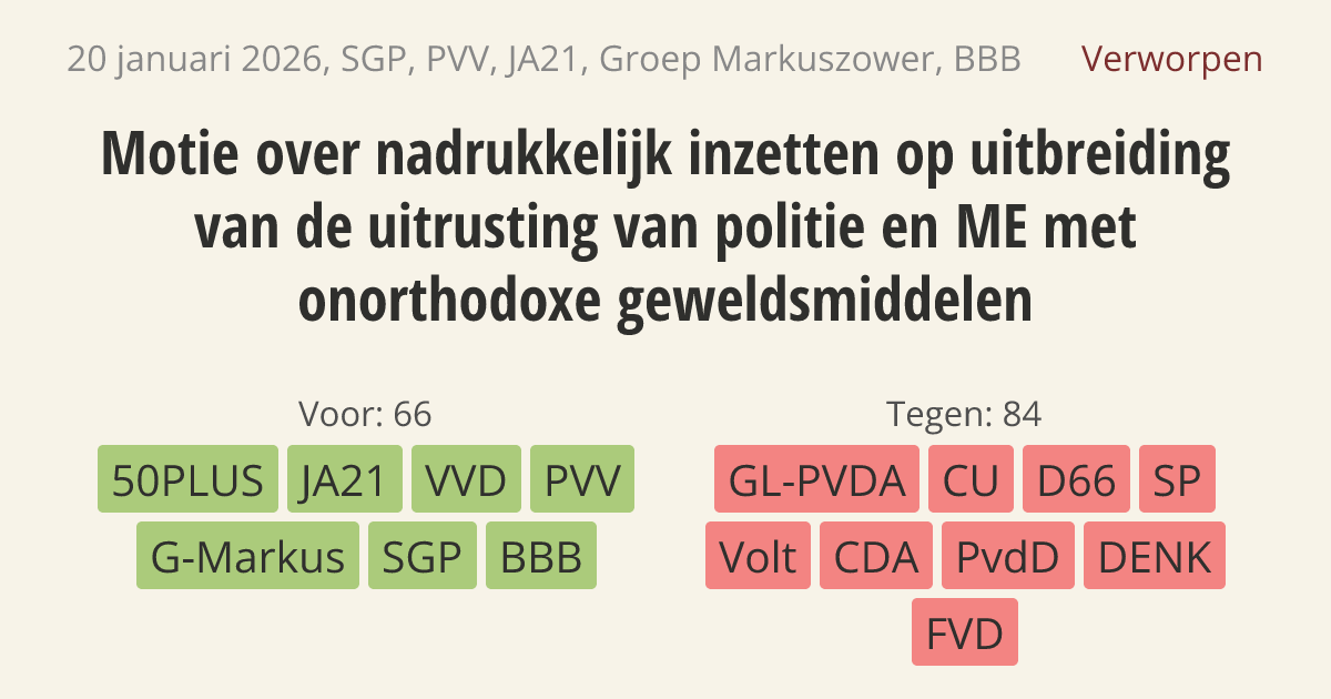 De regering moet de uitrusting van de politie en de Mobiele Eenheid (ME) uitbreiden met nieuwe wapens zoals rubberkogels en traangas. De politie krijgt nu te maken met extreem geweld tijdens rellen. Met deze extra geweldsmiddelen kunnen agenten veiliger en krachtiger optreden bij grote verstoringen van de openbare orde.