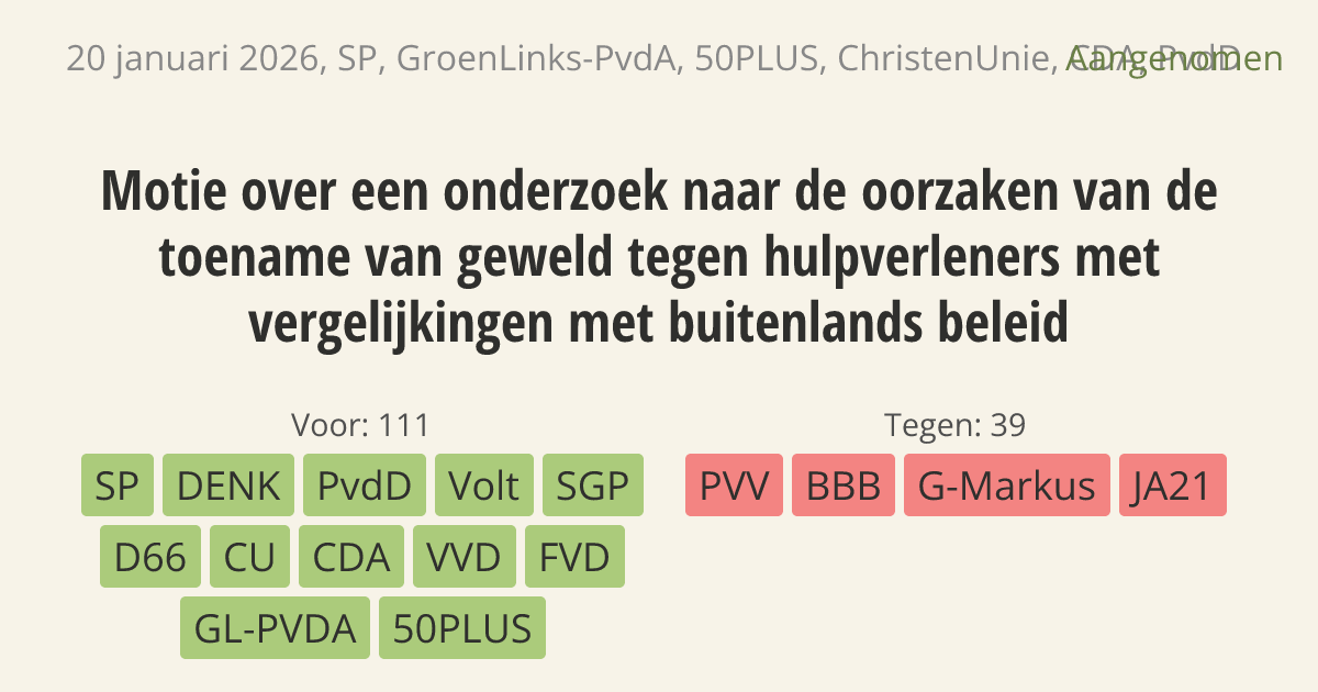 De regering moet de oorzaken van het toenemende geweld tegen hulpverleners onderzoeken. Hierbij moet Nederland leren van de aanpak in andere landen, zoals het Verenigd Koninkrijk. Geweld tegen hulpverleners neemt toe en er is meer kennis nodig over hoe dit voorkomen kan worden.