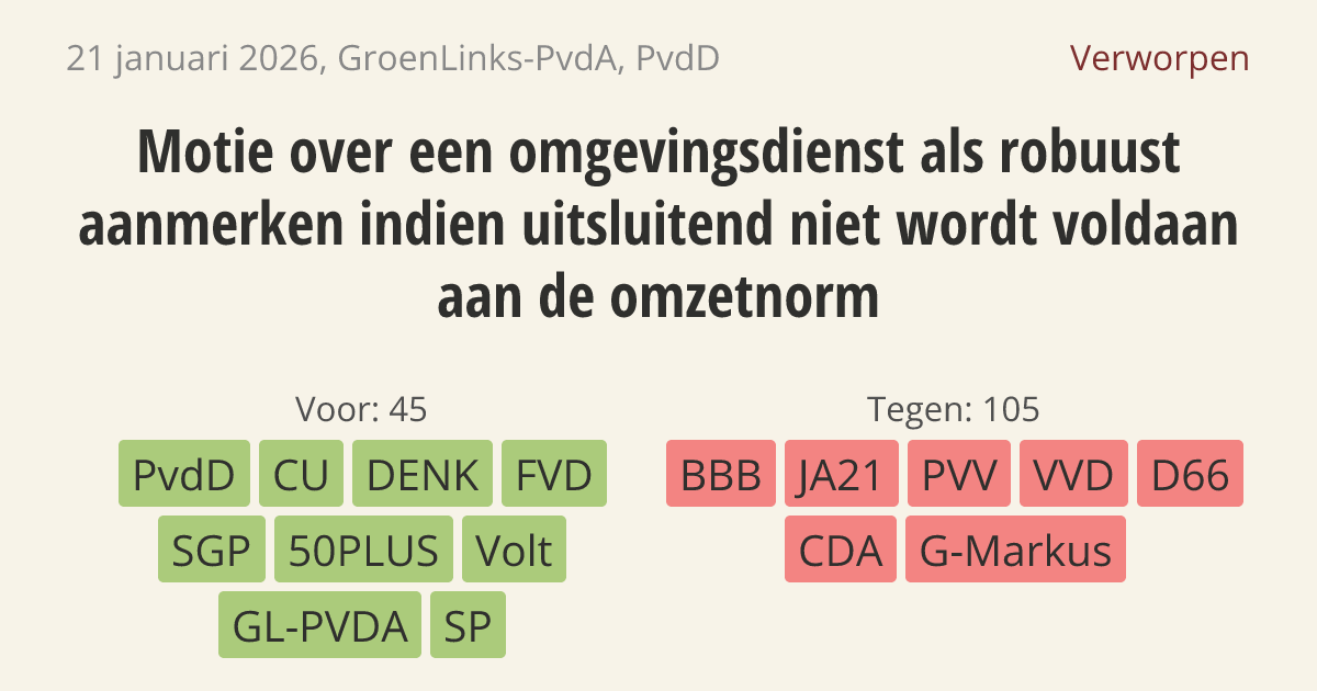 De regering moet omgevingsdiensten ook als ze niet aan de omzetnorm voldoen, goedkeuren. Deze diensten controleren of bedrijven zich aan milieu- en bouwregels houden. De eis voor een minimale omzet is onhaalbaar en zorgt ervoor dat diensten onnodig taken van gemeenten overnemen. Andere eisen voor kwaliteit en deskundigheid zijn belangrijker voor een goede werking.