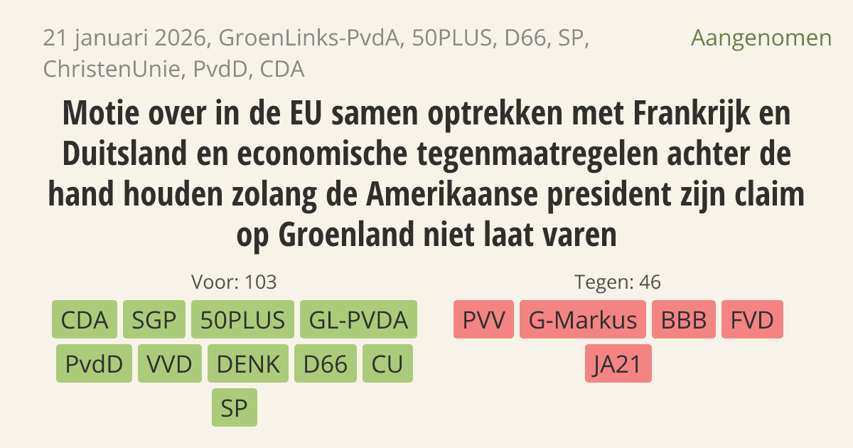 Het kabinet moet samen met Frankrijk en Duitsland Europese tegenmaatregelen voorbereiden tegen de Verenigde Staten. Economische of militaire druk van de VS om Groenland over te nemen is onacceptabel. De soevereiniteit van Groenland en Denemarken mag nooit ter discussie staan. Daarom moet het anti-dwanginstrument klaarliggen zolang de Amerikaanse president zijn claim niet intrekt.