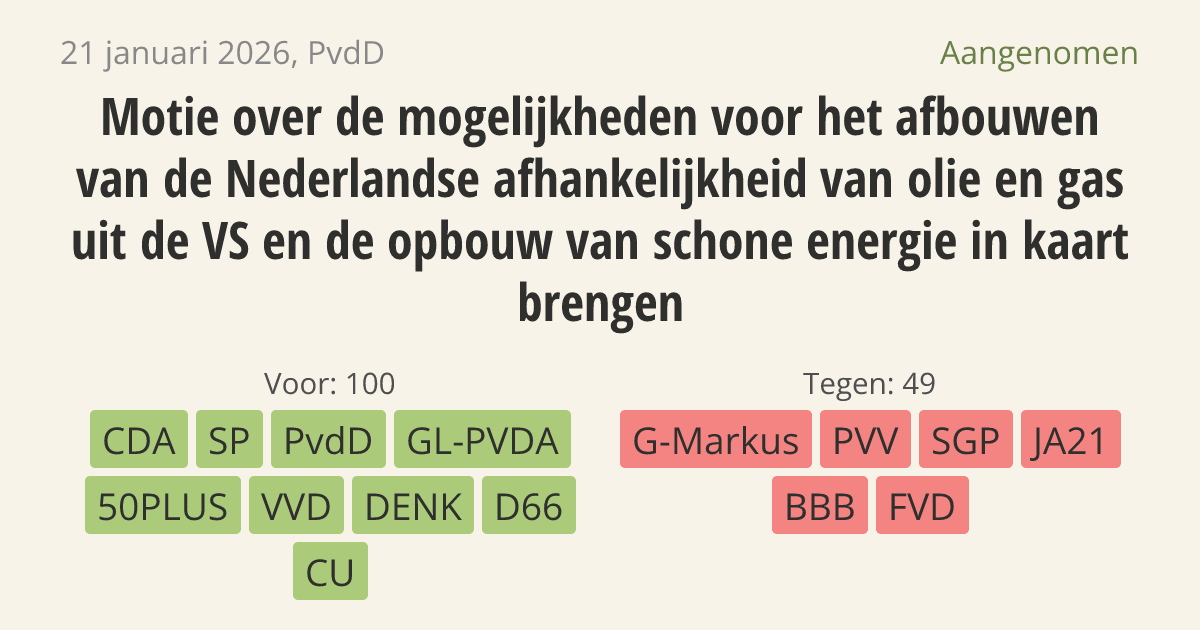 De regering moet de mogelijkheden onderzoeken om minder olie en gas uit de Verenigde Staten te importeren. Het is belangrijk dat Nederland strategisch onafhankelijk wordt van andere landen. Daarom moet de regering plannen maken voor meer schone energie en energiebesparing.