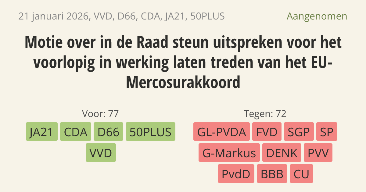 De regering moet in de Europese Raad steun uitspreken voor het voorlopig invoeren van het handelsverdrag tussen de Europese Unie en de Mercosur-landen. Handelsdeals zoals Mercosur zijn onmisbaar voor Europa om een machtig blok te kunnen zijn in de wereld. Een juridisch onderzoek door het Europese Hof kan de start van het verdrag namelijk jaren vertragen.