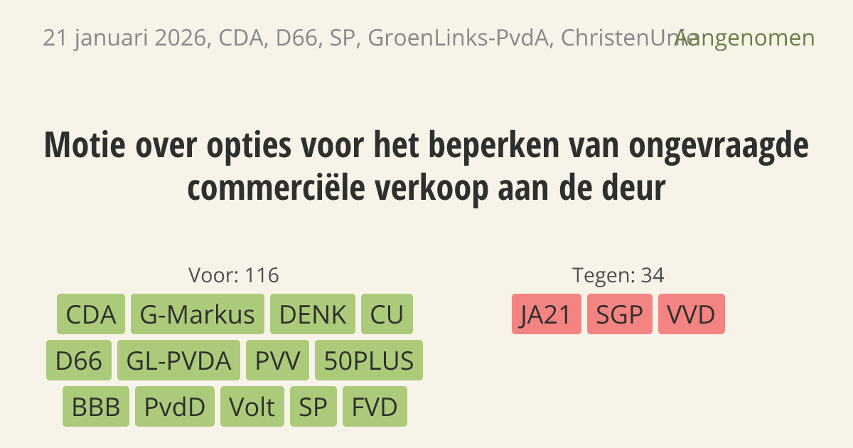 De regering moet uitzoeken hoe ongevraagde verkoop aan de deur gestopt kan worden. Er zijn steeds meer problemen met agressieve verkopers. Ook wil tachtig procent van de Nederlanders een verbod. Goede doelen en kleine buurtinitiatieven, zoals de SRV-wagen, moeten wel toegestaan blijven.