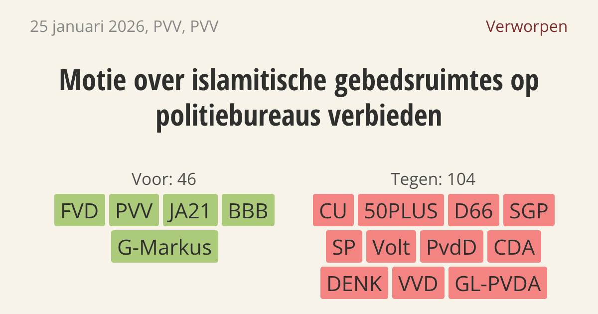 De regering moet islamitische gebedsruimtes op politiebureaus verbieden. De islam is in strijd met de democratische rechtsstaat. De politie heeft als kerntaak om deze rechtsorde juist te beschermen.