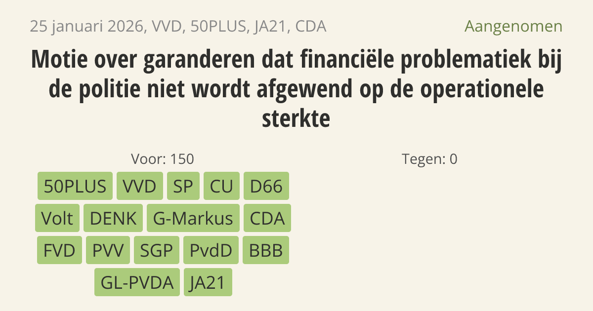 Het kabinet moet garanderen dat financiële tekorten bij de politie niet leiden tot minder agenten op straat. De leiding van de politie maakt nu keuzes die de inzetbaarheid van agenten in 2026 beperken. Dit is in strijd met eerdere afspraken dat de operationele slagkracht van de politie altijd voorrang moet krijgen.