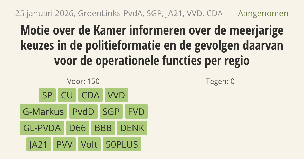 De regering moet voor de zomer uitleggen welke gevolgen geldtekorten hebben voor het aantal agenten in de regio. Op dit moment blijven vacatures openstaan om gaten in de begroting te dichten. Hierdoor is er minder politiecapaciteit beschikbaar dan beloofd.