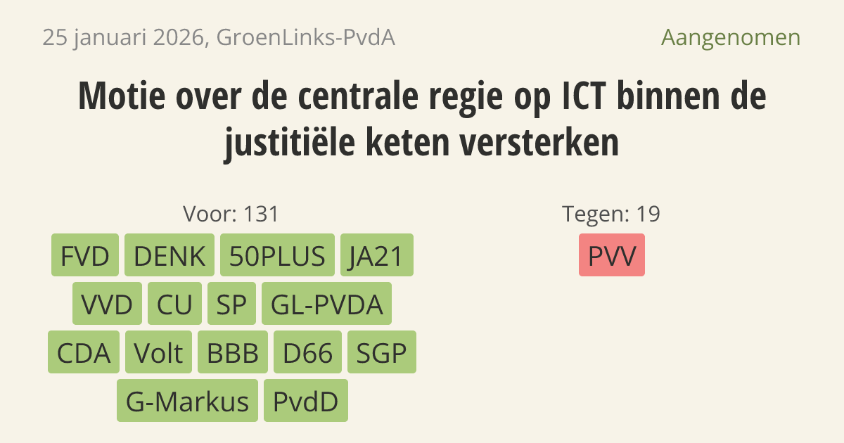 De regering moet onderzoeken hoe zij de centrale regie over ICT binnen de justitieketen kan versterken. Online criminaliteit groeit snel, terwijl de politie en het Openbaar Ministerie nu met verouderde systemen werken. Dit vormt een risico voor de veiligheid en de opsporing van misdadigers. Een regeringscommissaris of een onafhankelijke commissie moet hierbij gaan helpen.