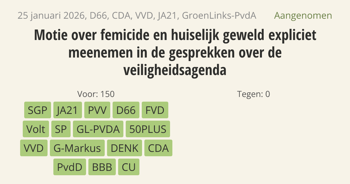 De regering moet geweld tegen vrouwen opnemen als officieel doel in de Veiligheidsagenda 2027-2030. Ook moeten femicide (vrouwenmoord) en huiselijk geweld een belangrijke plek krijgen in de gesprekken over deze agenda. Geweld tegen vrouwen is een diepgeworteld probleem in Nederland. Om dit beter aan te pakken, moet de politie hier in de toekomst meer voorrang aan geven.