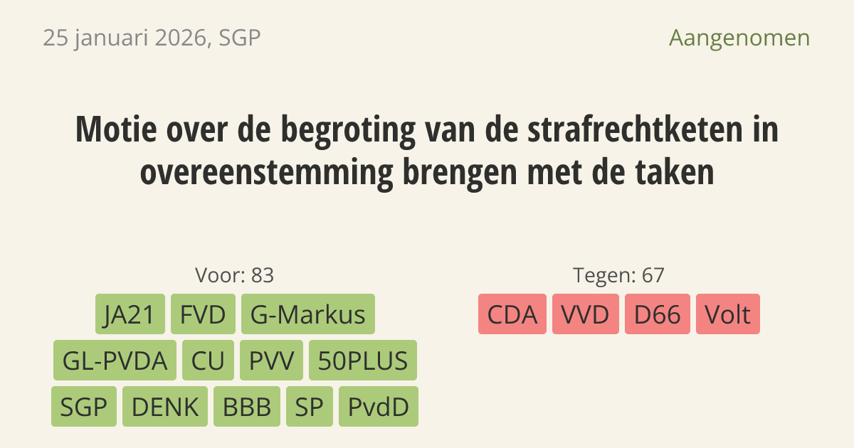 De regering moet zorgen voor een stabiel en hoger budget voor de strafrechtketen (politie, Openbaar Ministerie en rechtspraak). De afgelopen jaren zijn de taken zwaarder geworden zonder dat er genoeg geld bij kwam. Dit zorgt voor te hoge werkdruk, tekorten aan personeel en achterstanden bij het verwerken van rechtszaken.