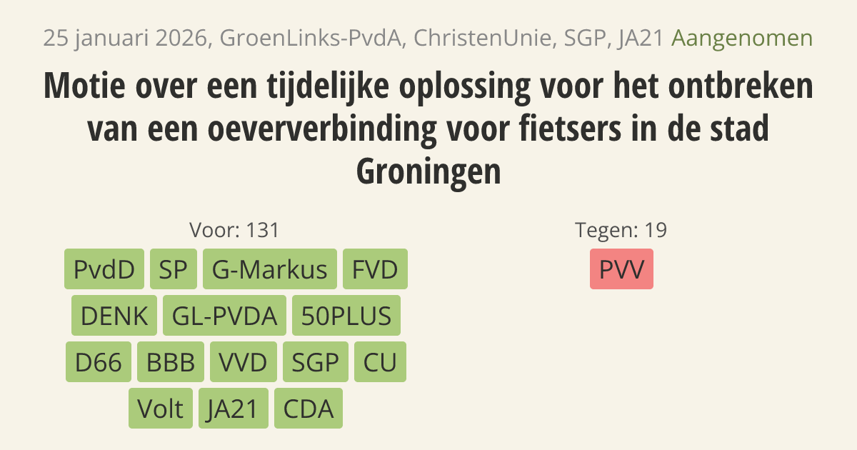 Motie van het lid De Hoop c.s. over een tijdelijke oplossing voor het ontbreken van een oeververbinding voor fietsers in de stad Groningen