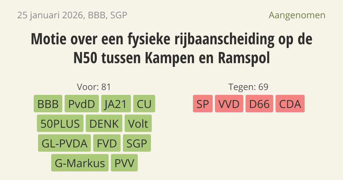 Motie van de leden Van der Plas en Stoffer over een fysieke rijbaanscheiding op de N50 tussen Kampen en Ramspol
