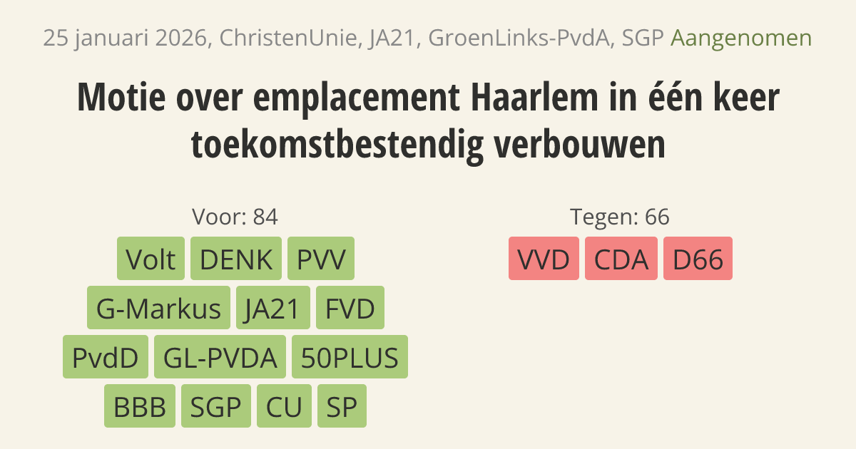 De regering moet zoeken naar geld om het spoor bij Haarlem in één keer volledig te vernieuwen. Nu dreigt de verbouwing in twee delen te gebeuren. Dat zorgt voor extra overlast voor reizigers en kost 50 miljoen euro meer. Door de aanpassing in één keer te doen, kunnen er bovendien sneller extra treinen rijden tussen Amsterdam, Haarlem en Den Haag.