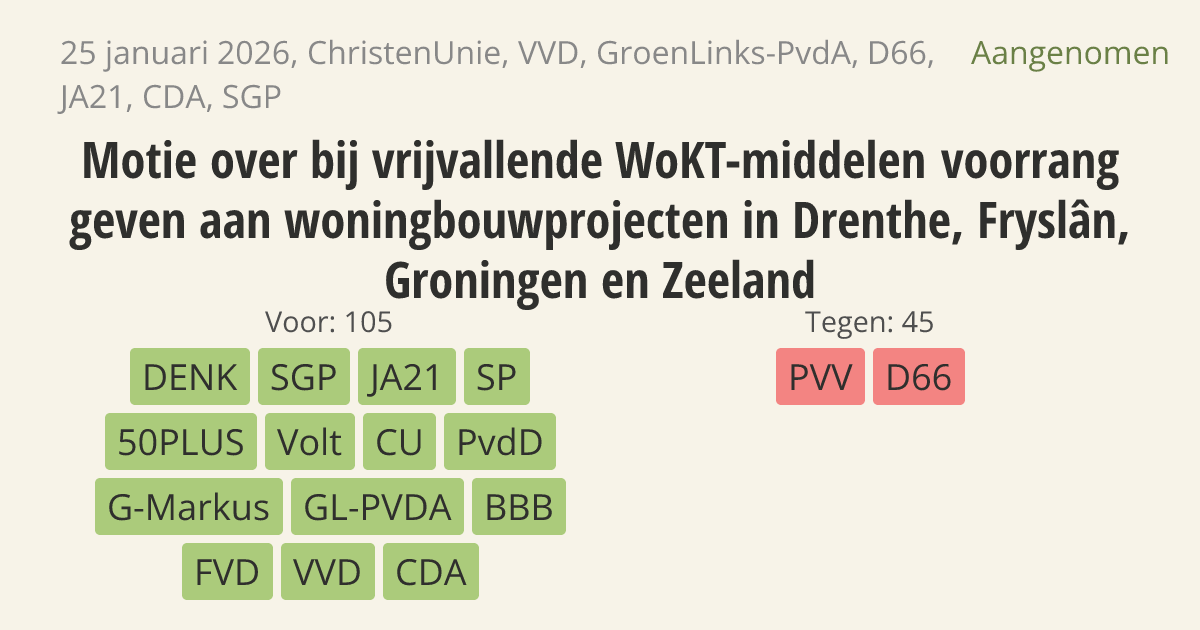 De regering moet bij nieuw woningbouwgeld voorrang geven aan projecten in Drenthe, Friesland, Groningen en Zeeland. Ook moet het makkelijker worden voor kleine gemeenten om samen geld aan te vragen. Nu gaat bijna al het geld voor bereikbaarheid en woningen naar andere delen van Nederland. Hierdoor worden projecten in de noordelijke provincies en Zeeland te vaak overgeslagen.
