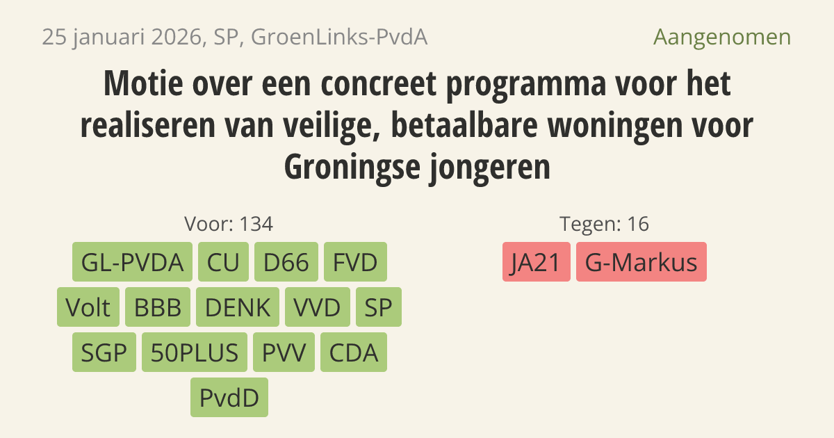 De regering moet samen met jongeren en lokale overheden een plan maken voor veilige en betaalbare woningen in Groningen. Dit moet gebeuren via nieuwbouw en het verbouwen van lege panden. Jongeren in deze regio hebben het extra lastig op de woningmarkt, omdat veel huizen daar beschadigd of onveilig zijn door de aardbevingen.