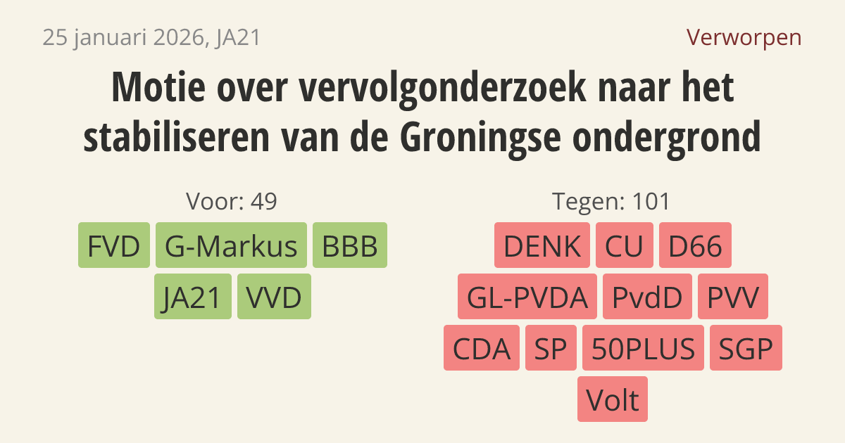 De regering moet onderzoek doen naar manieren om de ondergrond in Groningen en Noord-Drenthe stabieler te maken, bijvoorbeeld door stikstof in de bodem te spuiten. De bodem blijft daar nog tientallen jaren onveilig. Met dit onderzoek wil de overheid de kans op nieuwe aardbevingen verkleinen.