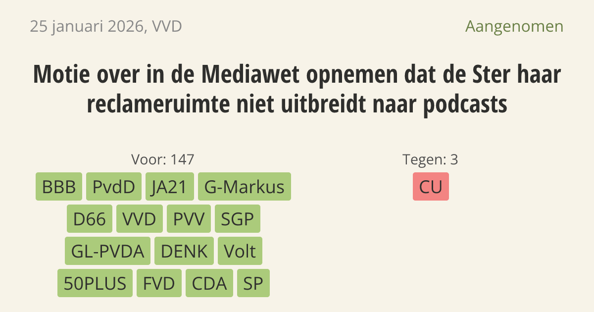 De regering moet in de nieuwe Mediawet vastleggen dat de Ster geen reclame mag maken in podcasts van de publieke omroep. Op dit moment is er voor podcasts nog geen duidelijke regelgeving. Het toestaan van reclame bij de publieke omroep verstoort de balans met commerciële mediabedrijven.