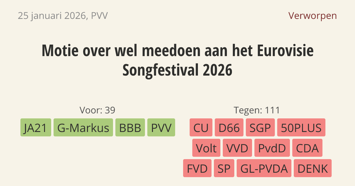 Motie van het lid Martin Bosma over wel meedoen aan het Eurovisie Songfestival 2026