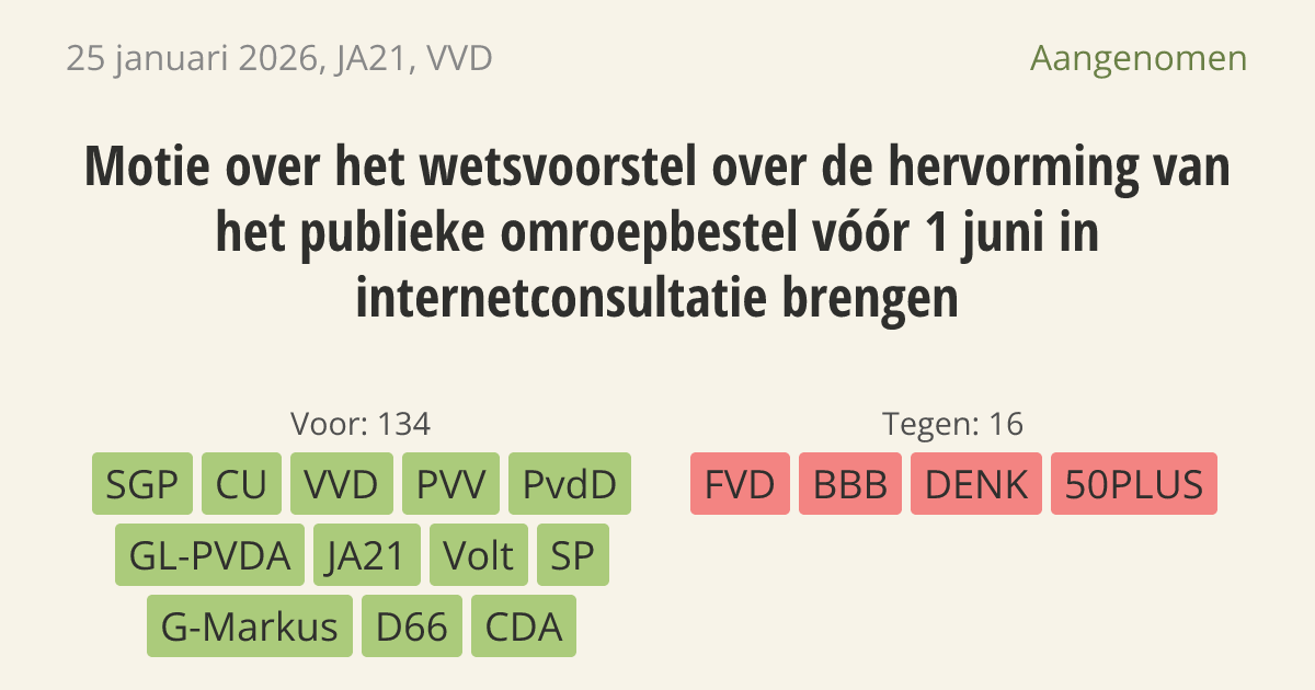 De regering moet de plannen voor een nieuwe publieke omroep uiterlijk 1 juni online zetten voor commentaar. Ook moet er vóór de zomer een duidelijke planning zijn. Het huidige systeem is hard aan vernieuwing toe. Als de voorstellen te laat bij de Tweede Kamer komen, kan de broodnodige verandering pas in 2034 ingaan in plaats van in 2029.