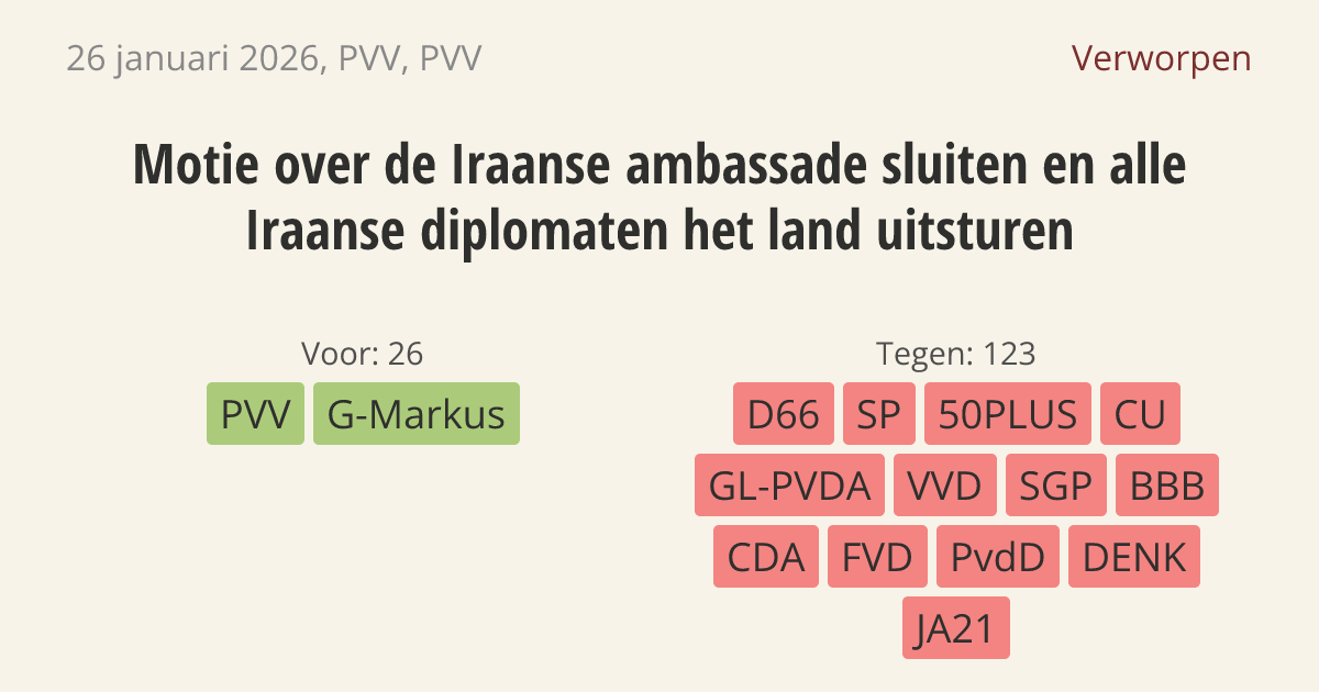 Motie van de leden De Roon en Wilders over de Iraanse ambassade sluiten en alle Iraanse diplomaten het land uitsturen