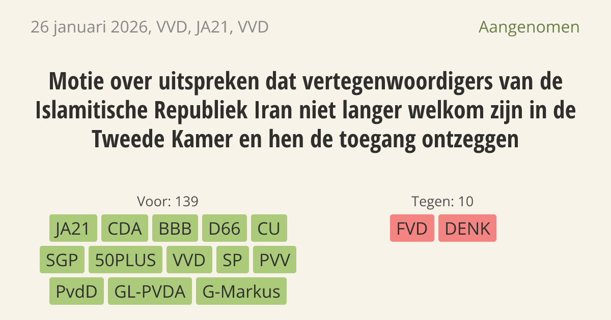 De Tweede Kamer mag geen podium bieden aan het regime van Iran. Terwijl de Iraanse bevolking vecht voor vrijheid, reageert de regering daar met geweld en moord. Daarom zijn diplomaten en andere vertegenwoordigers van de Islamitische Republiek Iran niet langer welkom in de gebouwen van de Tweede Kamer.