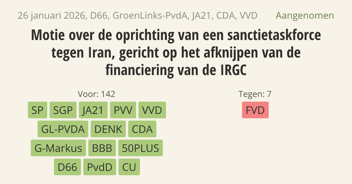 De regering moet binnen de Europese Unie pleiten voor een speciale werkgroep die de geldstromen van de Islamitische Revolutionaire Garde (IRGC) blokkeert. Dit legeronderdeel onderdrukt de eigen bevolking met geweld en ondersteunt terrorisme in de regio. Een sanctiewerkgroep is nodig om de financiële macht van dit regime effectief aan te pakken.