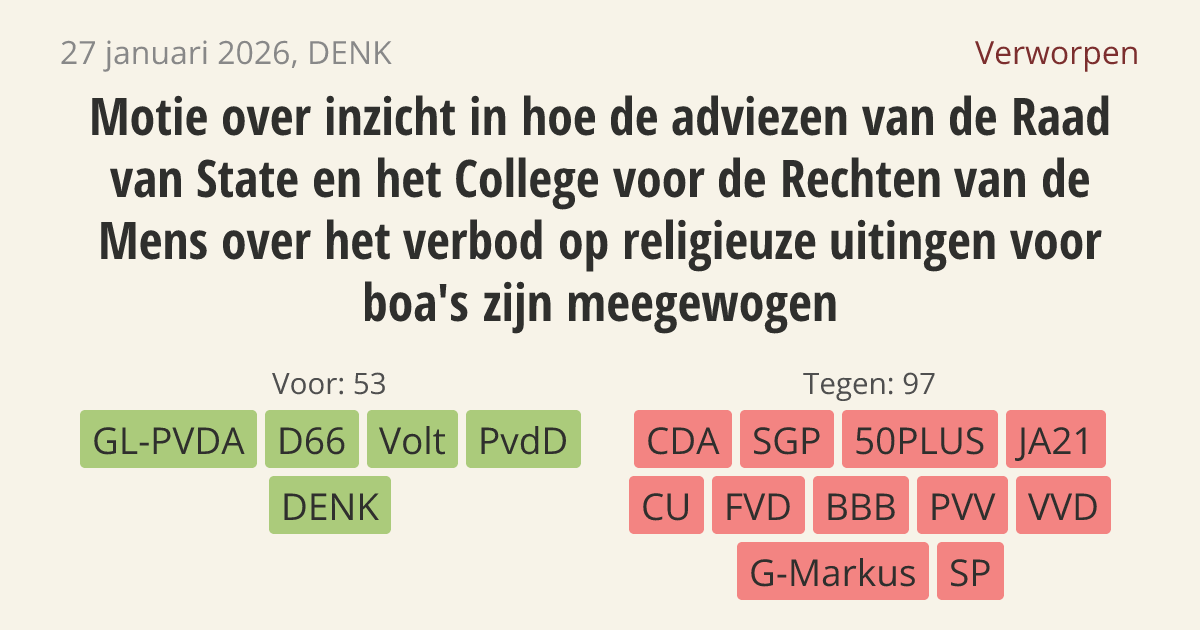 De regering moet opnieuw kijken naar het verbod op religieuze uitingen (zoals een hoofddoek of keppel) voor boa's (buitengewoon opsporingsambtenaren). De Raad van State en het College voor de Rechten van de Mens hebben namelijk ernstige bezwaren tegen dit verbod. De regering moet uitleggen hoe zij met deze belangrijke adviezen is omgegaan.