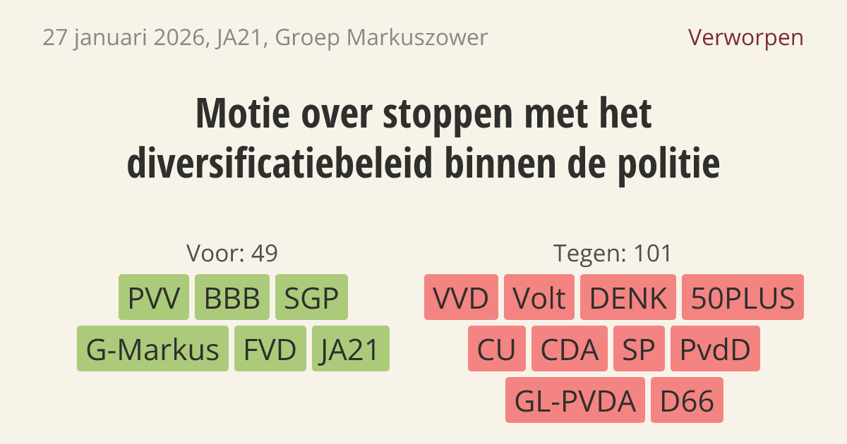 De regering moet stoppen met het diversiteitsbeleid binnen de politie. De politie heeft grote problemen met het uitvoeren van haar werk. Door te stoppen met dit beleid komen er meer mensen en geld vrij voor de belangrijkste politietaken.