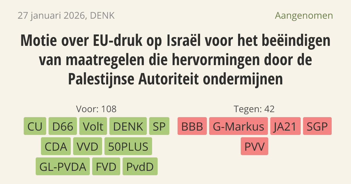 Motie van het lid Van Baarle over EU-druk op Israël voor het beëindigen van maatregelen die hervormingen door de Palestijnse Autoriteit ondermijnen