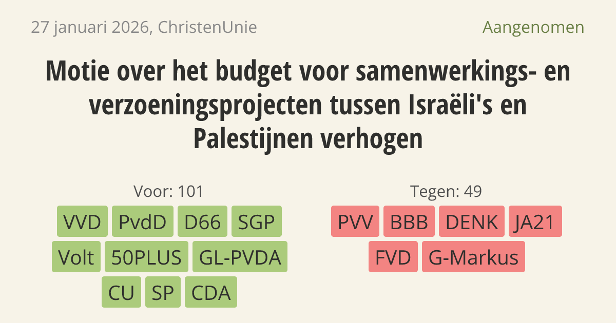 De regering moet dit jaar 250.000 euro extra reserveren voor projecten die samenwerking tussen Israëli's en Palestijnen stimuleren. Het is juist nu erg belangrijk om te investeren in vrede en contact tussen deze groepen vanuit de samenleving zelf. Dit geld komt in het Stabiliteitsfonds, een potje voor hulp in conflictgebieden.