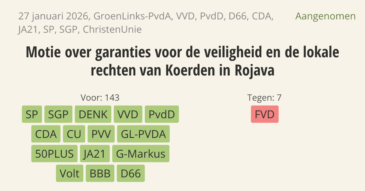 De regering moet blijven aandringen op garanties voor de veiligheid en lokale rechten van Koerden in Rojava (Noord-Syrië). De Koerden hebben daar sinds 2012 zelfbestuur. Zij waren een onmisbare bondgenoot in de strijd tegen terreurgroep IS en hebben geholpen bij het stoppen van het kalifaat.