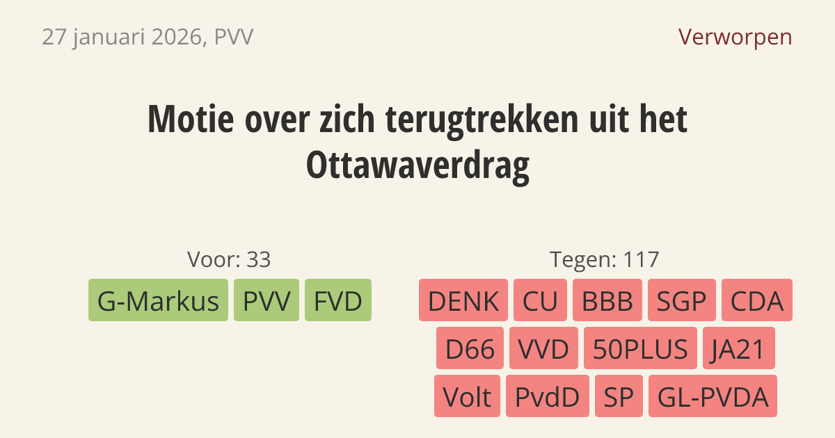 Motie van het lid De Roon over zich terugtrekken uit het Ottawaverdrag
