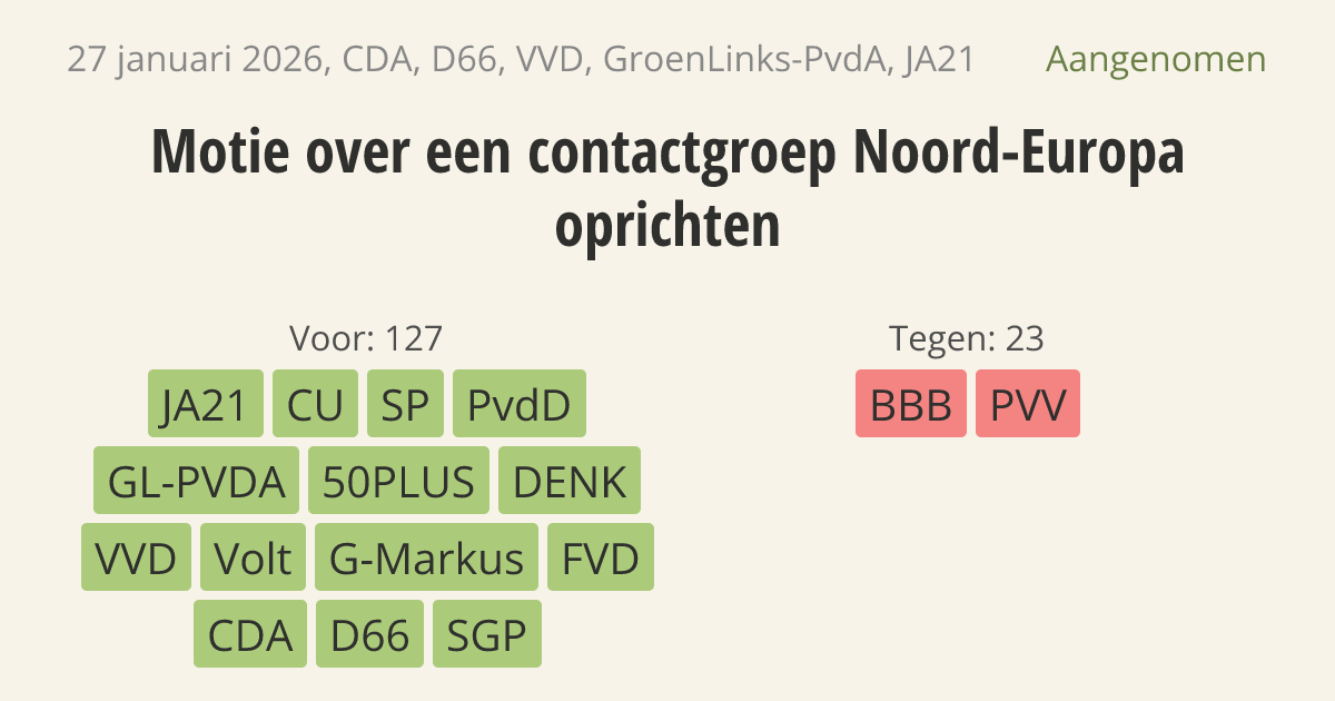 De voorzitter van de Tweede Kamer moet dit jaar een contactgroep Noord-Europa oprichten. Nederland en de Europese Unie moeten minder kwetsbaar worden. Daarom is vaste samenwerking nodig met gelijkgestemde landen op gebieden zoals grondstoffen, leger en energie. Ambassadeurs uit Noord-Europa hebben al aangegeven dat zij vaker met Nederland willen samenwerken.