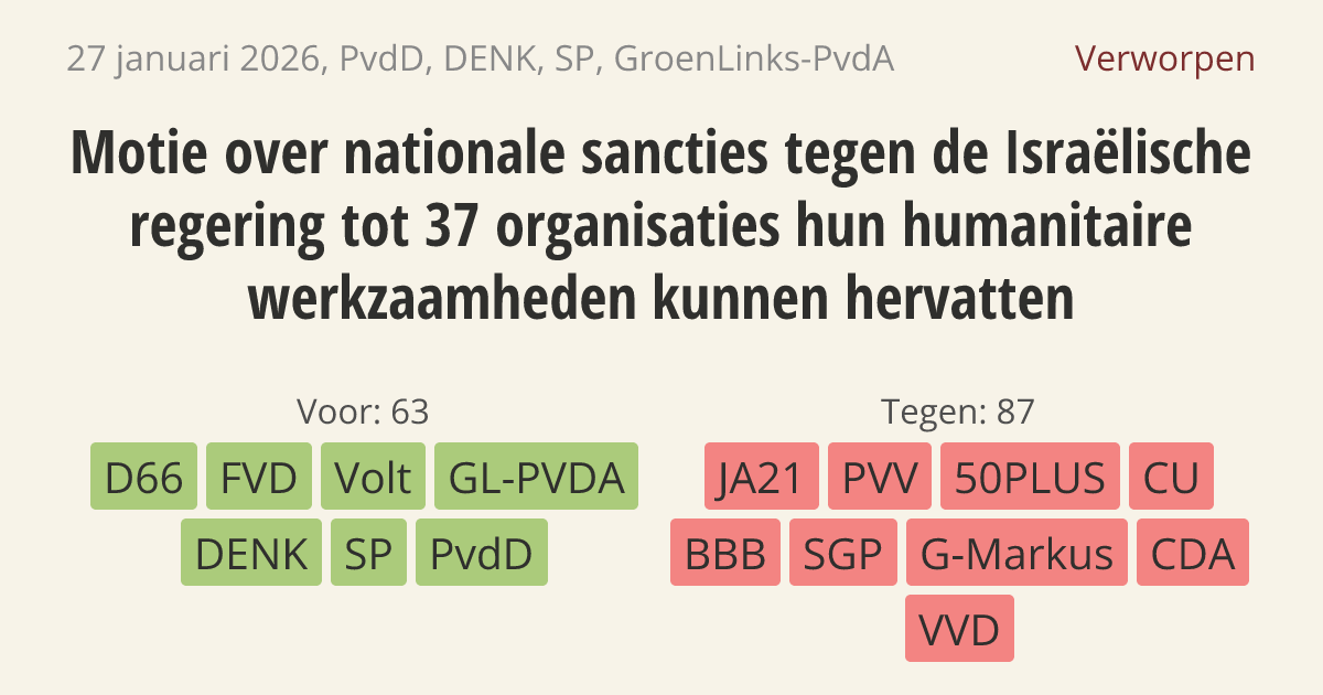 De regering moet sancties invoeren tegen de Israëlische regering. Dit moet gebeuren omdat Israël de vergunningen van 37 hulporganisaties heeft ingetrokken. Hierdoor stopt belangrijke noodhulp voor Gaza en de Westelijke Jordaanoever, zoals voedsel en zorg. Volgens het internationaal recht is deze hulp noodzakelijk om een volkerenmoord te voorkomen.