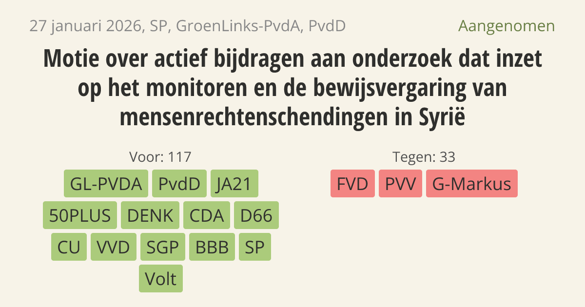 dat inzet op het monitoren en de bewijsvergaring van mensenrechtenschendingen in Syrië, en de Kamer over deze bijdrage te informeren.