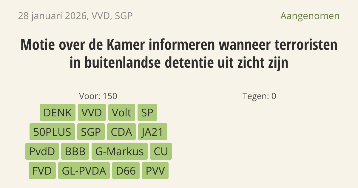 De regering moet de Kamer direct informeren als Nederlandse terroristen ontsnappen uit buitenlandse cellen of terugkeren naar Nederland. De aanwezigheid van deze terugkeerders zorgt voor grote risico's voor de nationale veiligheid. Het doel is dat deze terroristen in de regio waar zij vastzaten worden berecht en niet zomaar onopgemerkt terugkomen.