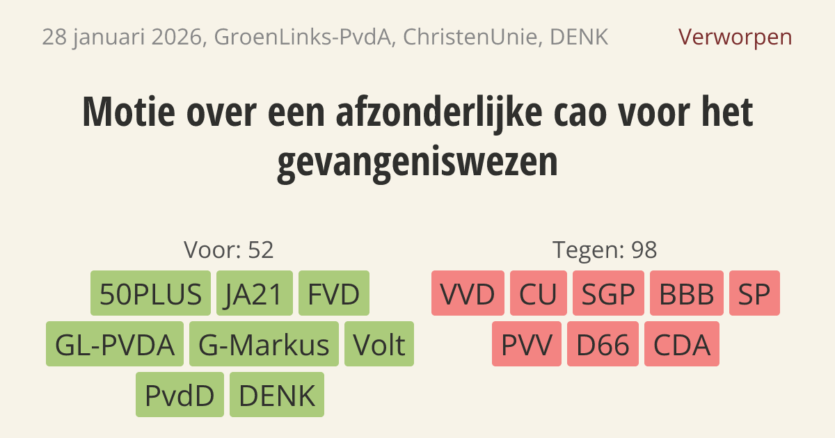 De regering moet samen met de medewerkers een aparte cao voor het gevangeniswezen maken. De huidige algemene regels voor rijksambtenaren passen niet bij de hoge werkdruk in gevangenissen. Een eigen cao is nodig om huidig personeel te behouden en nieuwe collega’s aan te trekken bij de Dienst Justiti'ele Inrichtingen (DJI).