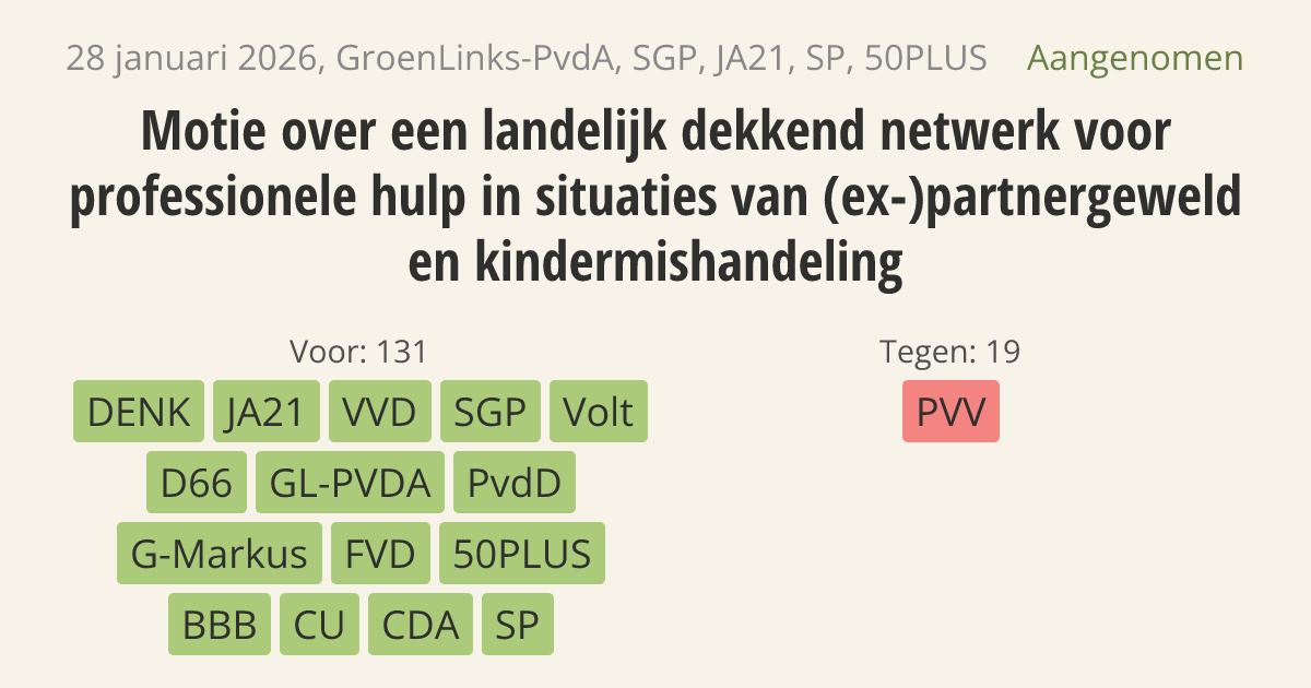 De regering moet zorgen voor één landelijk netwerk van twaalf locaties voor hulp bij partnergeweld en kindermishandeling. Organisaties zoals Filomena en de Centra Seksueel Geweld hebben al veel ervaring met deze aanpak. Een goede uitvoering van Europese regels tegen huiselijk geweld is nodig om geweld in de privésfeer beter te voorkomen en te bestrijden.