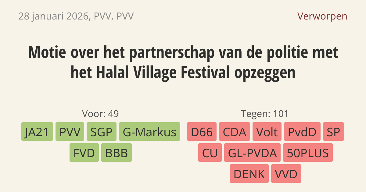 De regering moet de samenwerking tussen de politie en het Halal Village Festival verbreken. De politie werft nu personeel op dit evenement, maar het festival heeft een te sterke politieke lading. Volgens de indieners is het festival een pro-Palestijns activistisch evenement.