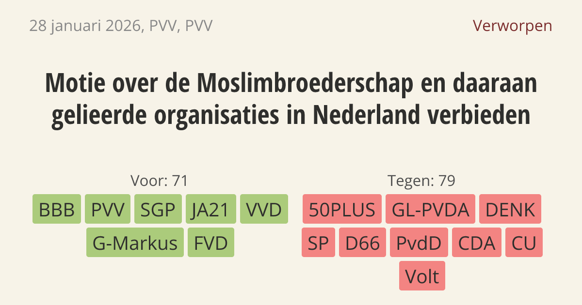 De regering moet de Moslimbroederschap en alle organisaties die hierbij horen in Nederland verbieden. Er zijn zorgen dat deze groep op lange termijn probeert de samenleving over te nemen om een islamitisch rijk met strenge religieuze wetten te stichten.