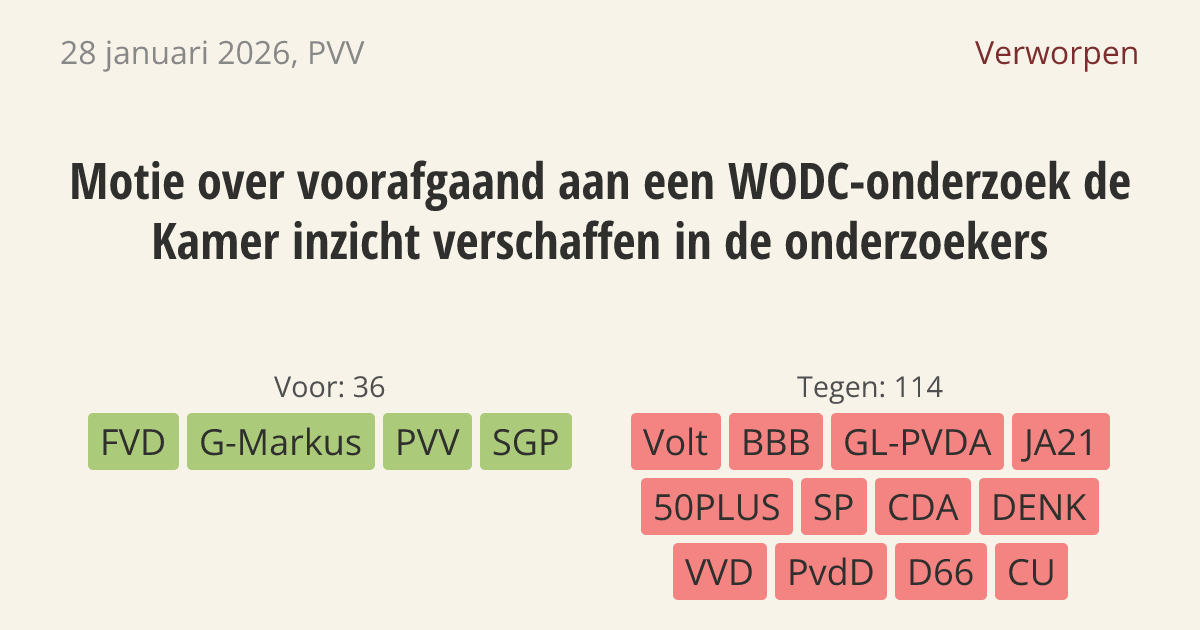 De regering moet de Kamer informatie geven over de achtergrond en belangen van onderzoekers van het WODC. Dit instituut doet belangrijk onderzoek voor justitie en veiligheid. Nu zijn de onderzoekers vaak nog onbekend, terwijl het belangrijk is om te weten of zij onafhankelijk en deskundig zijn.