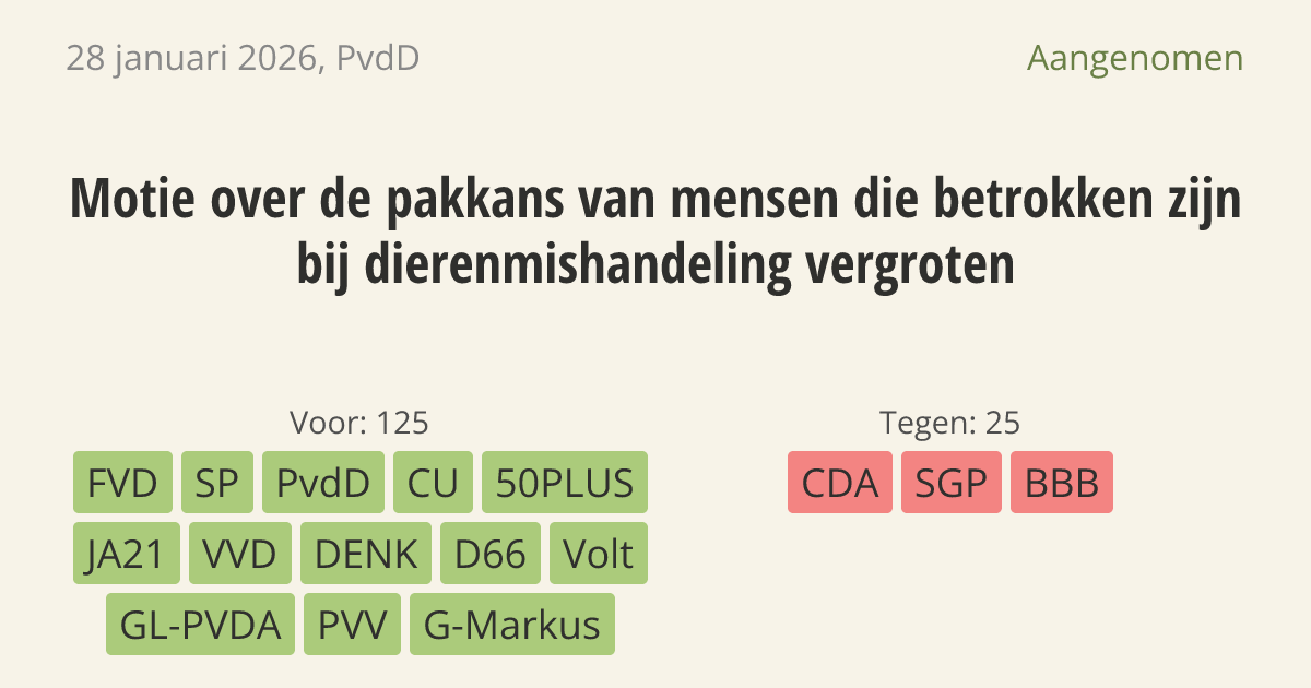 De regering moet onderzoeken hoe de pakkans voor dierenbeulen omhoog kan. Er zijn strengere straffen zoals een levenslang houdverbod, maar die werken alleen als daders ook echt worden gepakt. Nu blijven misstanden te vaak onzichtbaar en ongestraft.