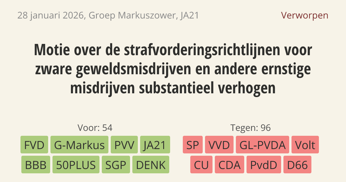 De regering moet samen met het Openbaar Ministerie de regels voor strafeisen verhogen. Bij zware geweldsmisdrijven zoals verkrachting, overvallen en zware mishandeling vallen de straffen nu te laag uit. De huidige straffen passen niet bij de ernst van de misdaad en de gevoelens van rechtvaardigheid in de samenleving.